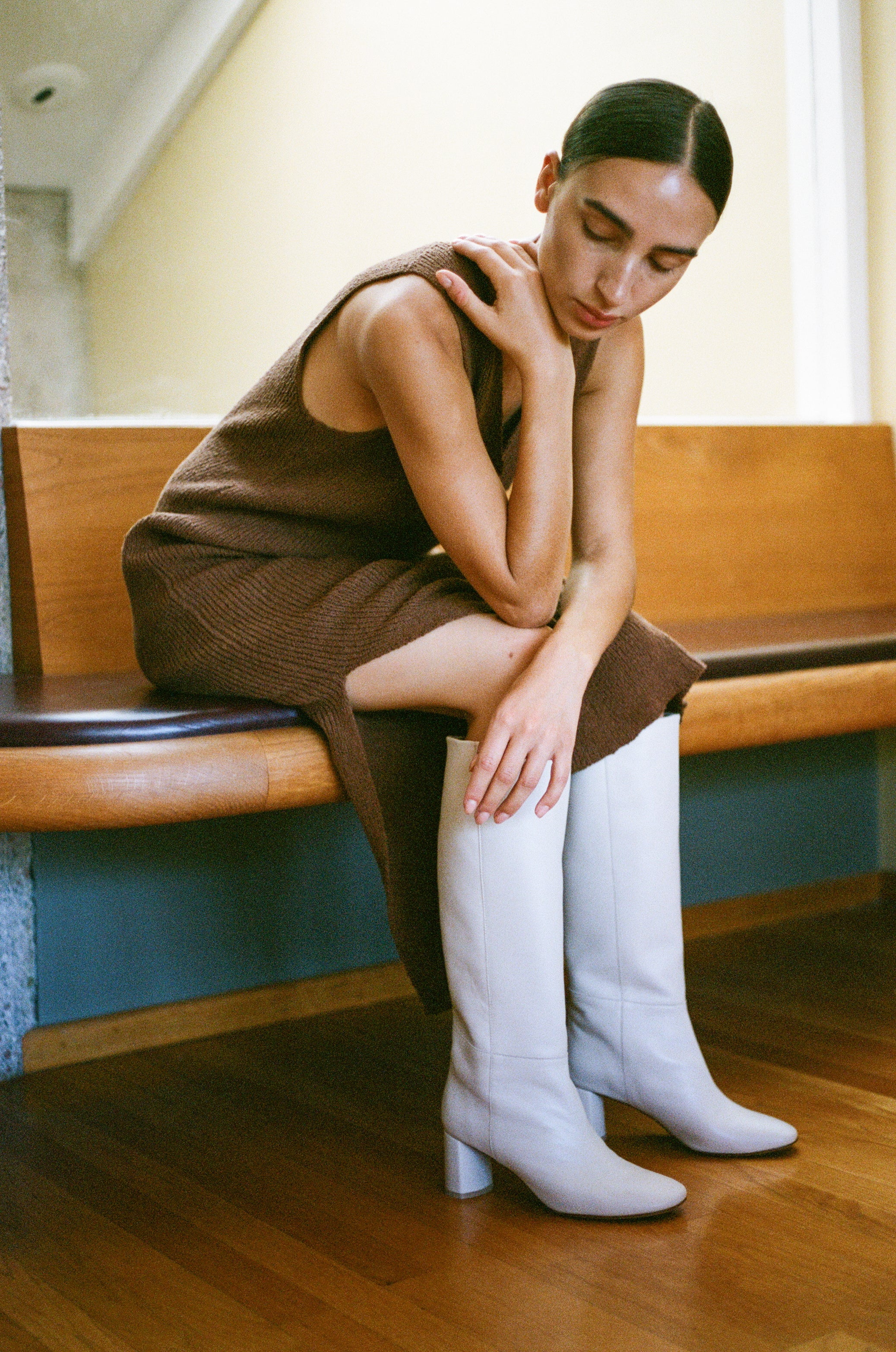 Made in Spain, The Donna is a tall pull-on boot in a supple soft cream leather that sits below the knee. Round toe and 2 ½ā rounded block heel wrapped in leather. Padded leather footbed and leather sole.Ā Fits true to size.